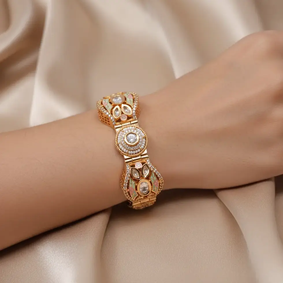 Kundan & Pearl Bracelet with Green Beads | Gold Plated Wedding Bracelet