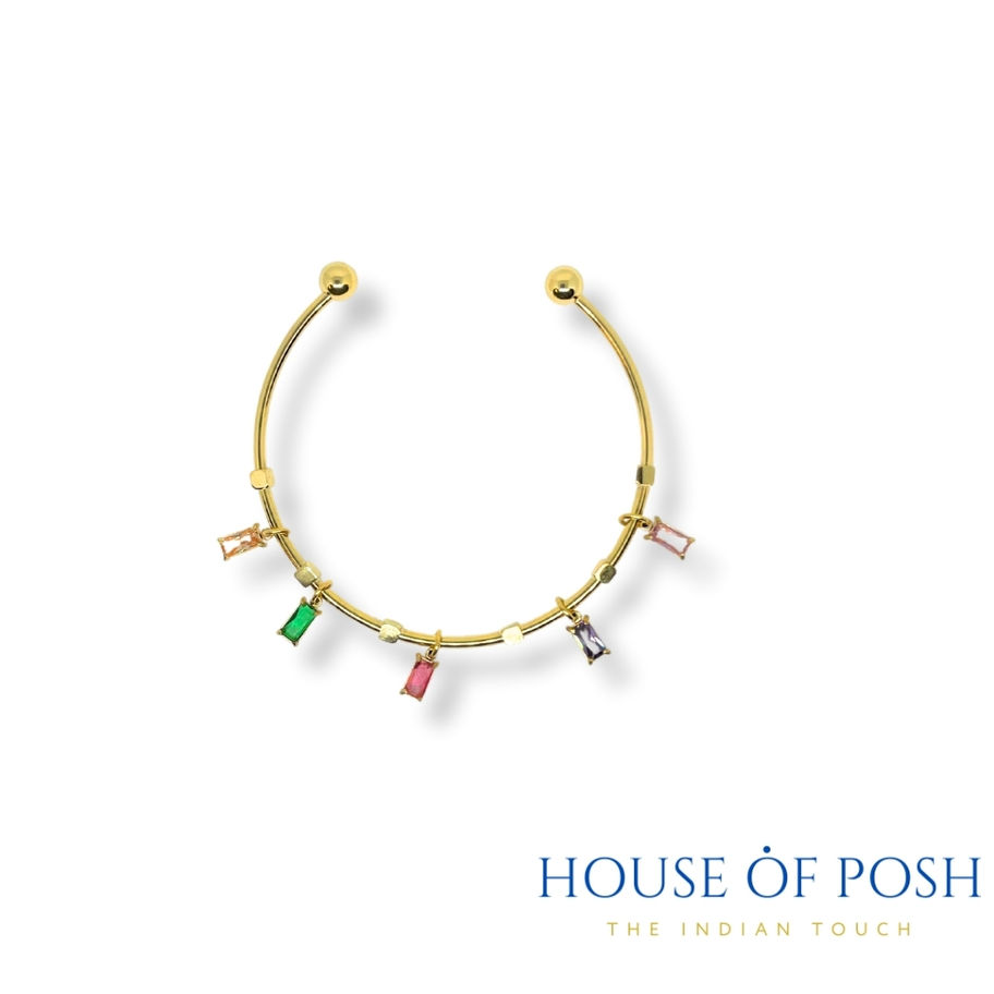 Add a touch of sparkle to your everyday look with this dazzling bangle bracelet. The gold-tone bangle is adorned with colorful rectangular gemstones that dangle from the sides, creating a playful and eye-catching look. It's the perfect accessory to brighten up any outfit.