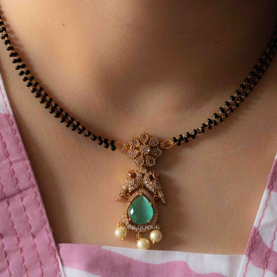 This piece features the essential double-strand black bead chain (symbolizing protection and marital bliss) accented by a sophisticated, gold-plated pendant. The pendant showcases a delicate peacock or stylized bird motif lavishly studded with bright CZ (Cubic Zirconia) stones. The centerpiece is a striking Emerald Green teardrop stone surrounded by micro-pave detailing, finished with elegant faux pearl drops. The high-quality gold plating gives it a rich, durable finish that mimics fine jewelry.