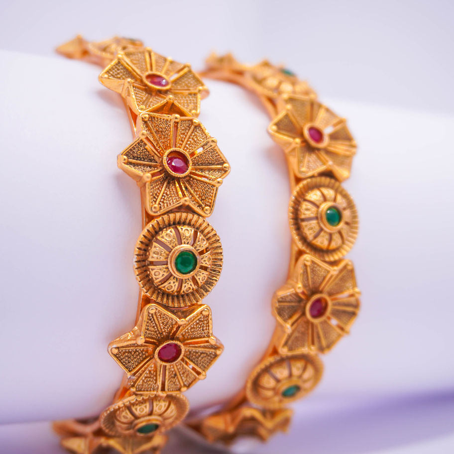 Discover the beauty of tradition with the *Floral Radiance Bangle Set* from House of Posh. These elegant traditional bangles are crafted with intricate gold floral motifs, beautifully complemented by vibrant green and pink stones. A perfect choice for adding timeless charm to any occasion, they effortlessly blend classic design with a touch of modern sophistication.