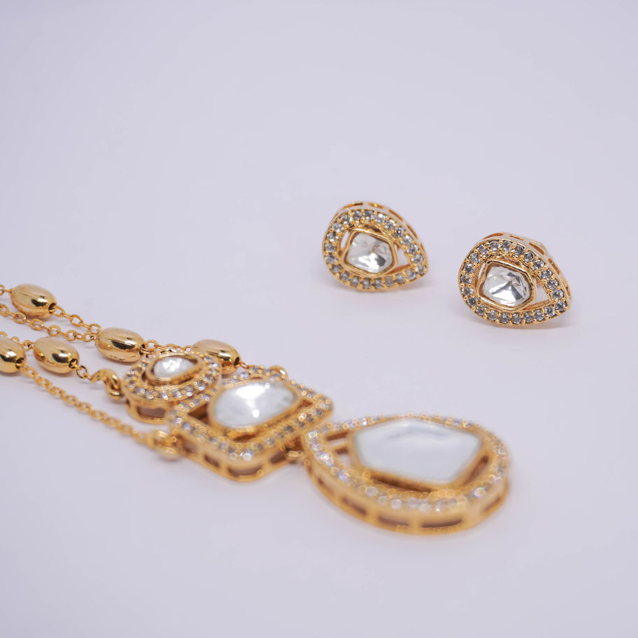 Gold-tone layered necklace featuring three geometric, clear crystal pendants (oval, square, and teardrop shapes) set within intricate, sparkling borders. The chain itself is a delicate gold-tone design with small, elongated bead accents.