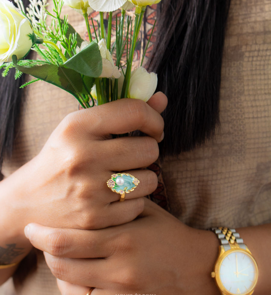 Crafted from Brass with a rich gold polish, the decorative oval face features layered Meenakari Enamel work in swirling mint green. A prominent freshwater pearl is the centerpiece, highlighted by soft pink and green floral enamel details. The combination of bright enamel and high-polish metal ensures the piece stands out.