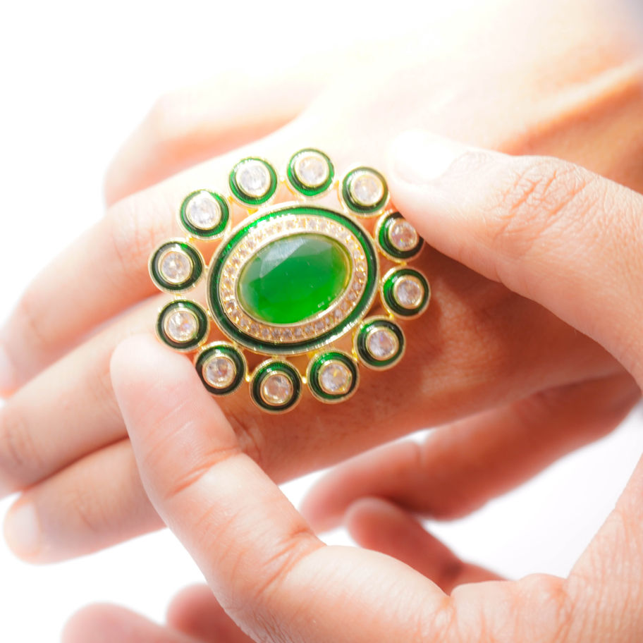 This stunning ring features a large oval emerald gemstone, radiating a deep, vibrant green hue. Surrounded by a delicate halo of sparkling Kundan stones, it creates a captivating contrast of color and texture. The gold-plated setting adds a touch of luxury, making this ring a timeless piece for any occasion.