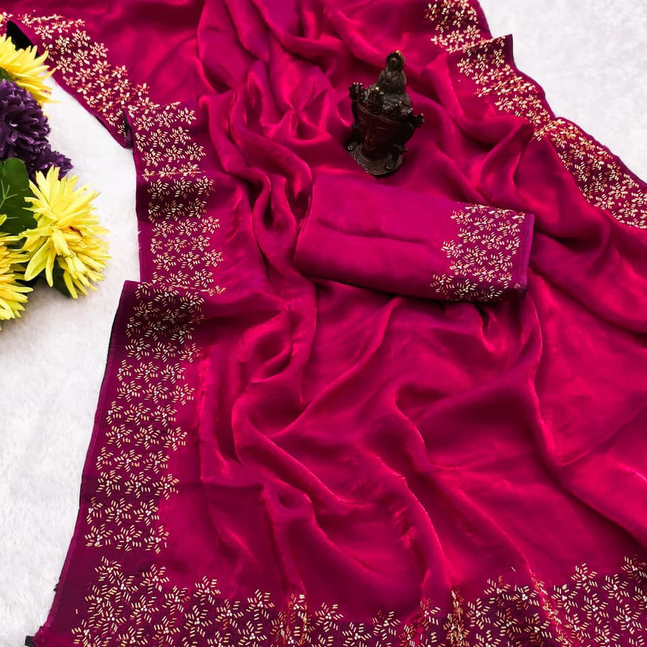 Step into timeless elegance with this rich red saree, crafted from soft, fancy satin that drapes beautifully and shines with sophistication. Adorned with delicate Zarkhan and bead work, this saree exudes luxury and grace. The saree comes with fall and pico done, making it completely ready to wear.