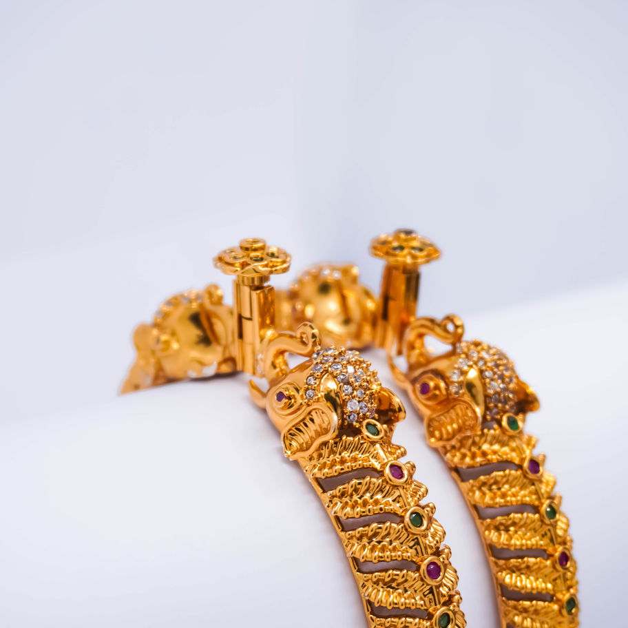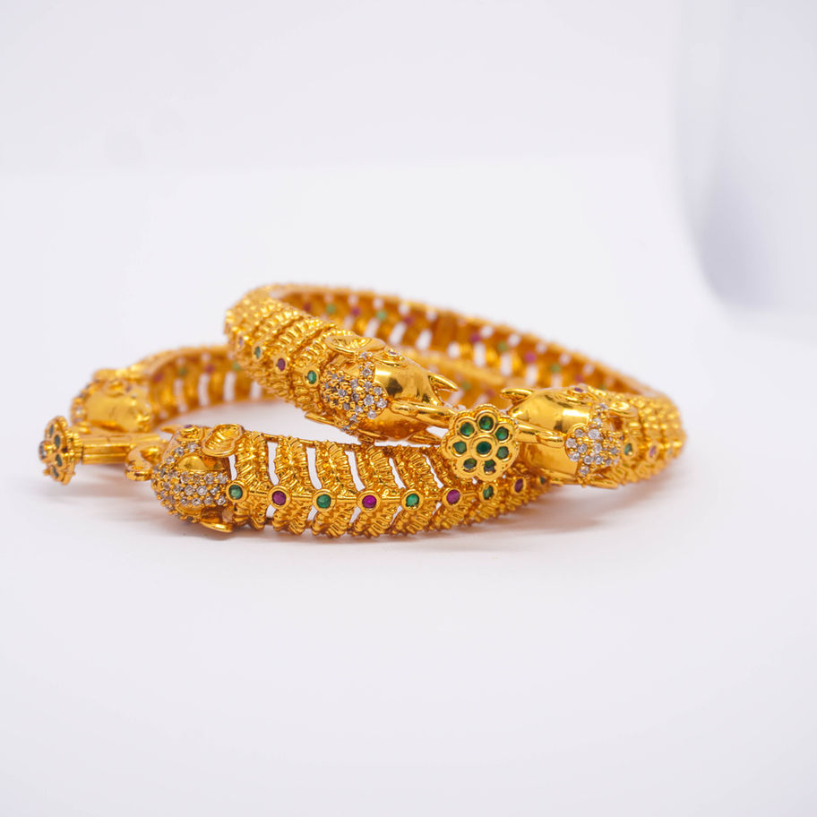 Adorn your wrists with elegance and grandeur with the *Regal Majesty Gold Bangle Set*. These intricately designed bangles feature exquisite detailing, from vibrant gemstone accents to bold lion head clasps, making them a perfect blend of tradition and regal charm. The openable design ensures a comfortable fit, accommodating up to a 2.8 size. Whether it's a festive occasion or a special celebration, these bangles are crafted to make a statement and are sure to turn heads wherever you go!