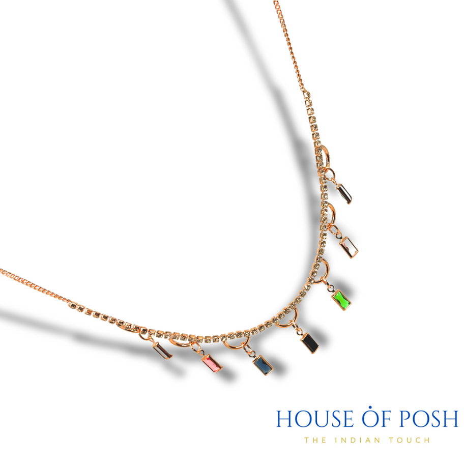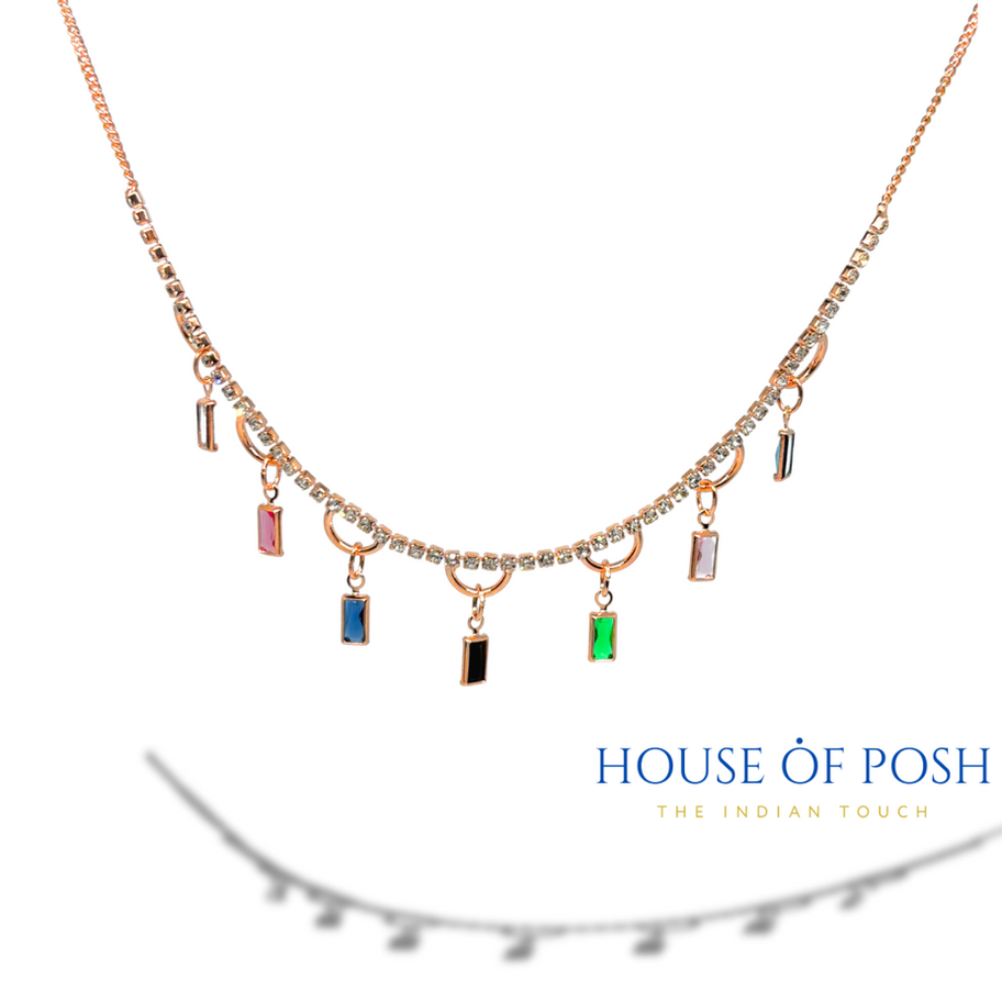 Step into a world of vibrant hues with this exquisite Indian choker, a symphony of color and design. Adorned with a dazzling array of colorful gemstones, this choker is a celebration of rich cultural heritage and unparalleled artistry. The delicate chain and intricate design add a touch of ethereal elegance. Whether you're dressing up for a special occasion or adding a touch of bohemian flair to your everyday look, this choker is sure to make a statement.