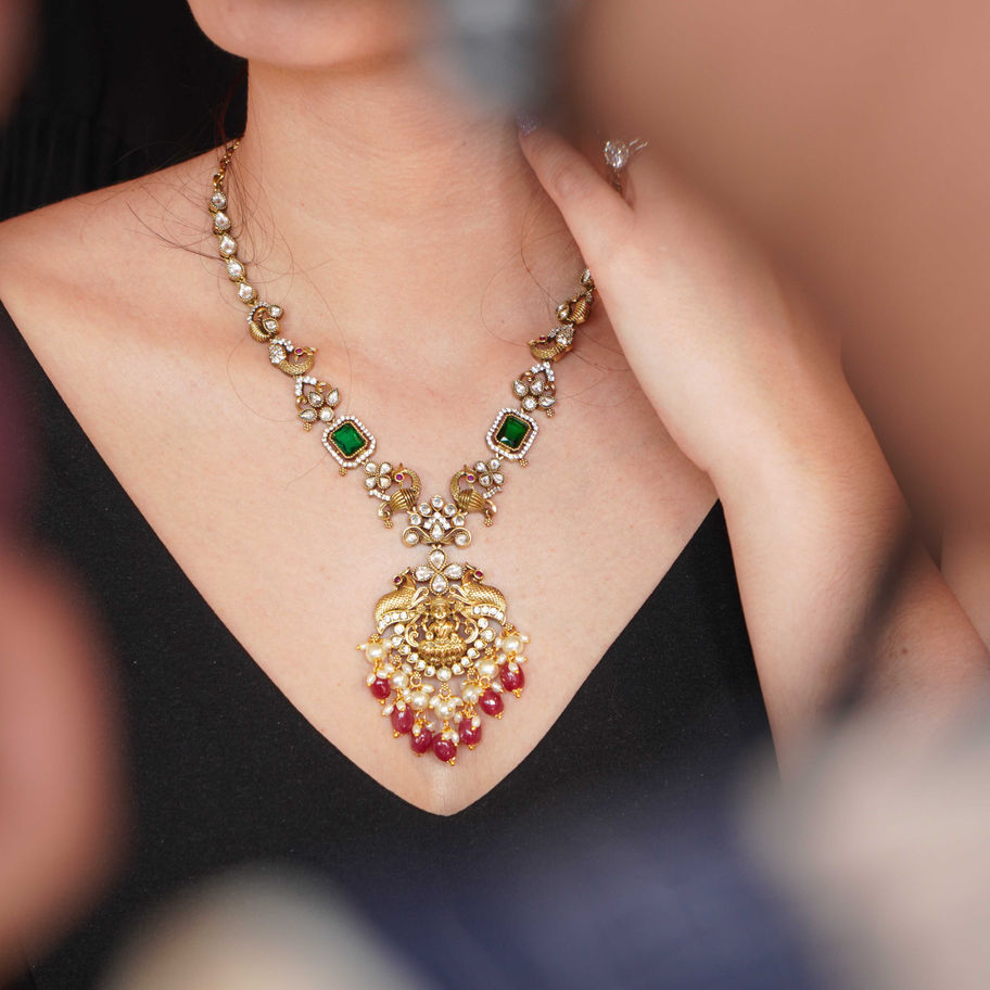 Emerald and Ruby Drop Temple Necklace Set