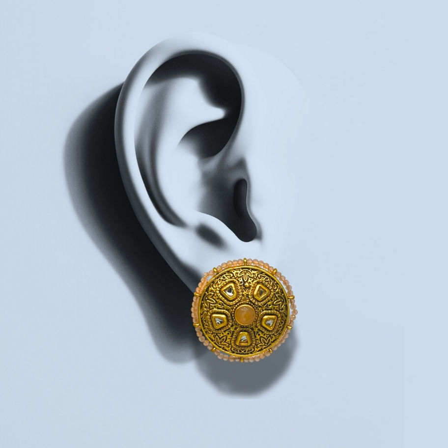 These exquisite earrings are a testament to the rich heritage of Indian jewelry-making. Crafted with intricate details and adorned with sparkling stones, they exude a captivating charm. The oval design, embellished with gold and black accents, adds a touch of elegance. These earrings are sure to make a statement and elevate any outfit.