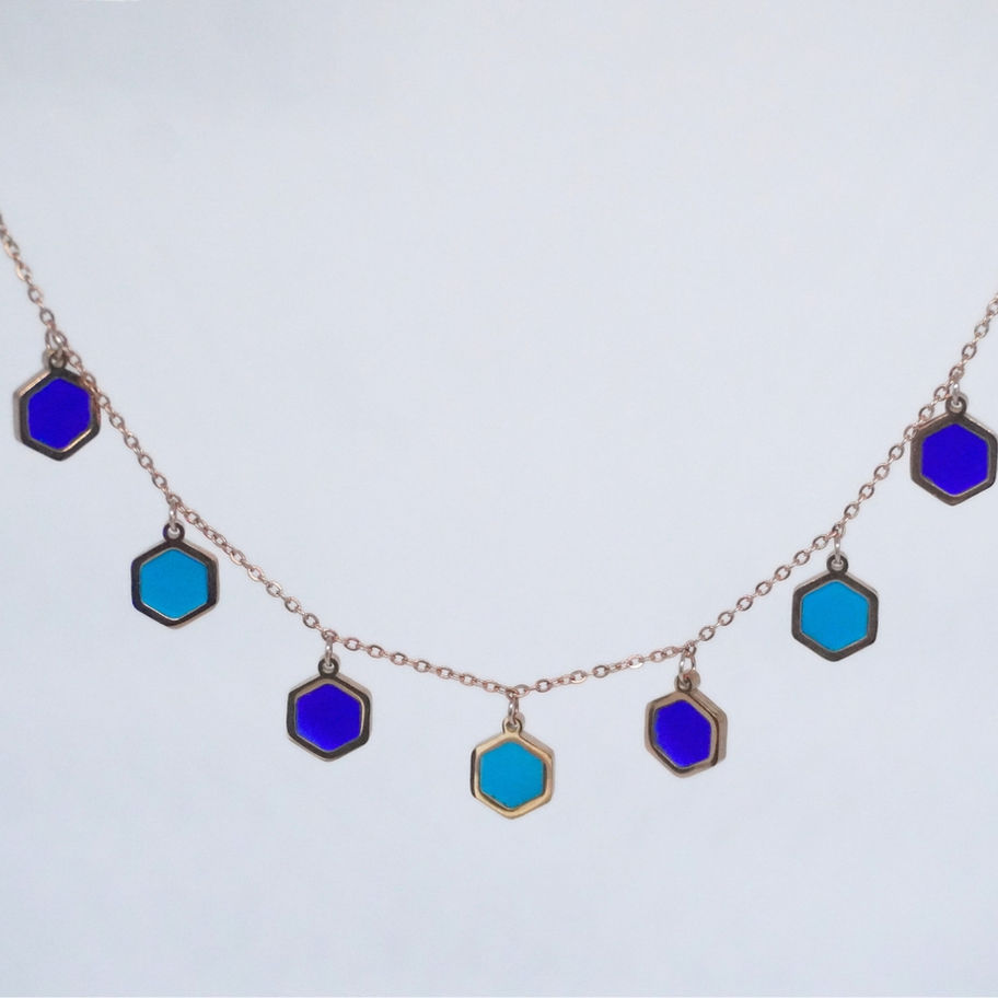 Add a touch of geometric charm to your look with this Hexagon Charm Necklace. Featuring a delicate gold-tone chain adorned with multiple hexagon-shaped charms in a mix of gold and blue tones, this necklace is perfect for adding a touch of modern elegance to any outfit.