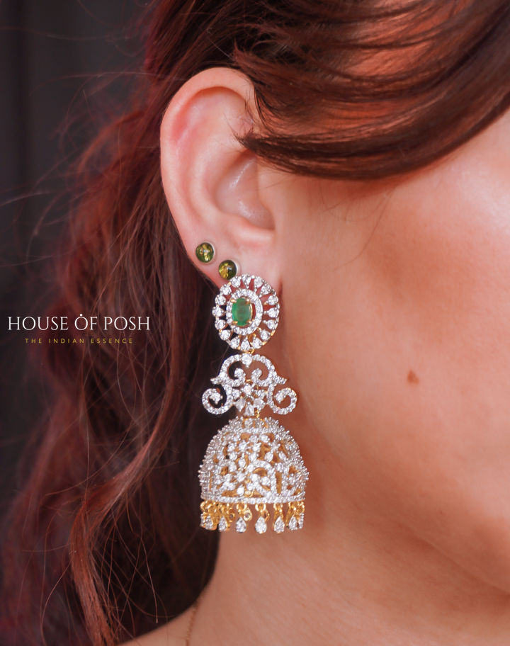 Silver-Plated Jhumka Earrings with Emerald and Zircon Accents