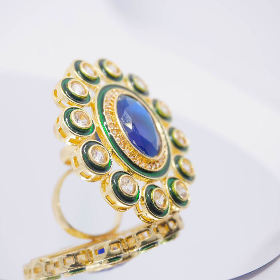 This elegant ring features a large oval blue stone surrounded by a halo of sparkling Kundan stones. It's crafted with gold-plated metal and accented with green enamel for a touch of color. A perfect piece to add a touch of sophistication to any outfit.