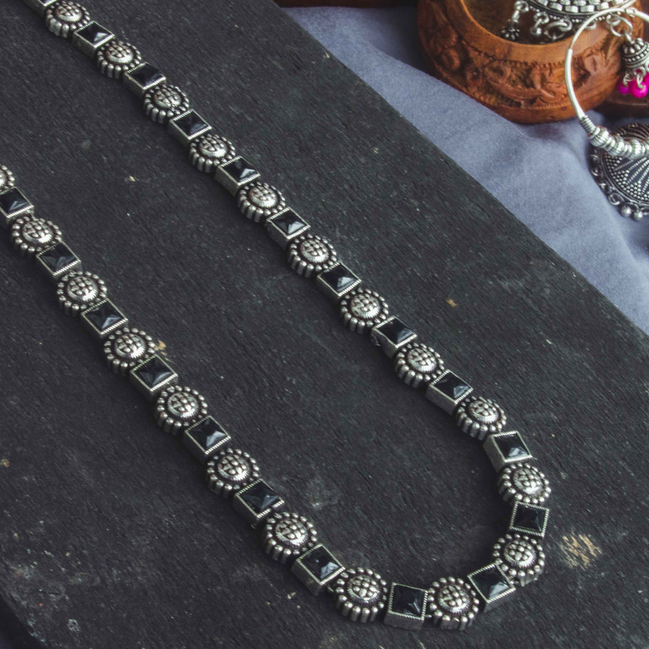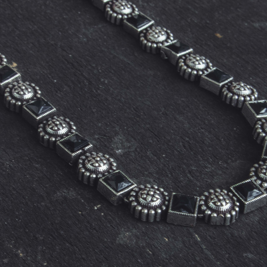 Each piece is made from a durable silver-plated alloy with a deep oxidized finish, creating a rich antique silver look. The necklace features an alternating pattern of intricate floral motifs and polished square black stones, strung together to form a flexible and comfortable chain. Its subtle shine and dark accents make it versatile and timeless.