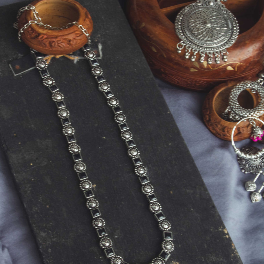 There’s a moment when a piece of jewellery doesn’t just match your outfit—it defines it. This Oxidized Silver Chain with Black Stones is crafted for that moment, offering a sophisticated blend of traditional charm and contemporary elegance. It effortlessly adds a refined touch to any ensemble.