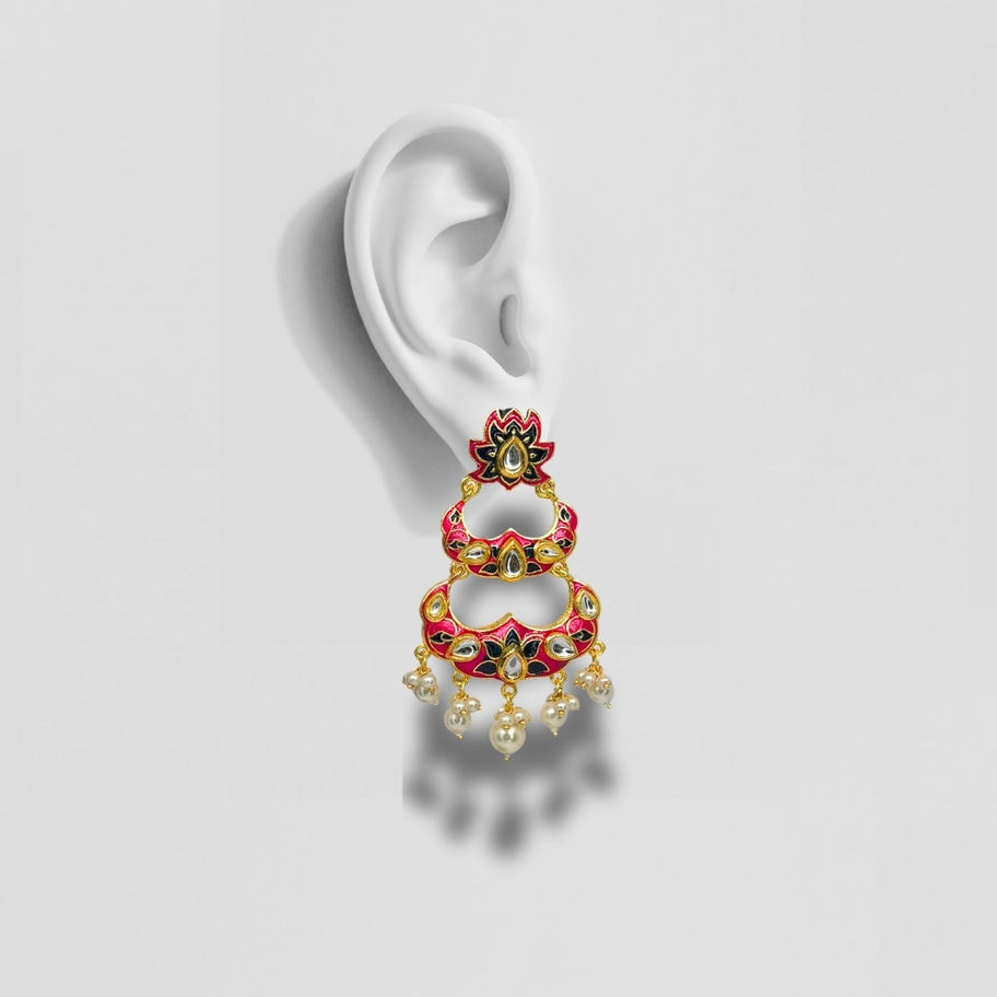Step into a world of enchantment with these exquisite Indian earrings, where vibrant hues meet intricate design. Inspired by the beauty of the lotus flower, these earrings are a celebration of rich cultural heritage and unparalleled artistry. The delicate design, adorned with a captivating blend of pink and black enamel, adds a touch of ethereal elegance. Whether you're dressing up for a special occasion or adding a touch of bohemian flair to your everyday look, these earrings are sure to make a statement.