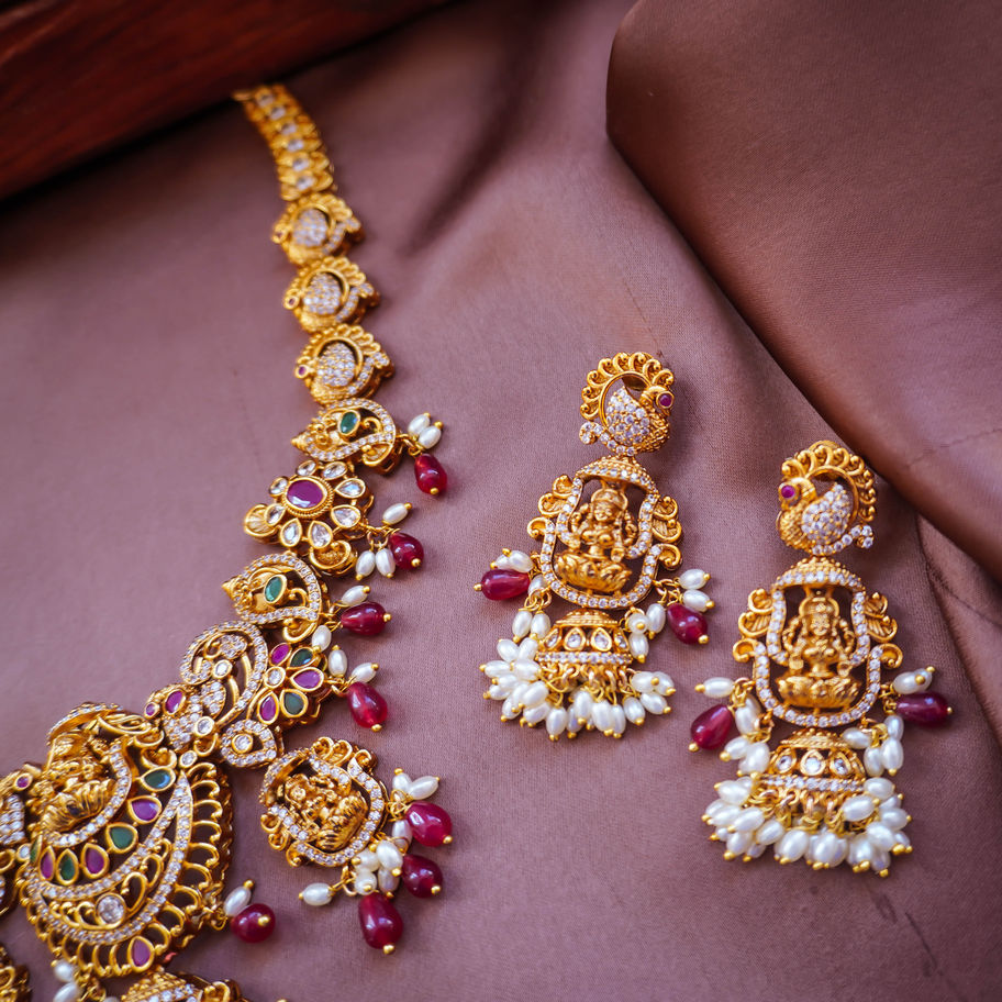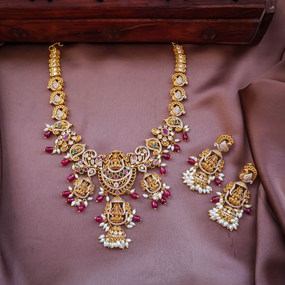 This intricately designed necklace and earring set showcases the beauty of traditional Indian jewelry. The gold plating highlights the detailed work, while the colorful stones and pearl accents add a touch of elegance and charm.