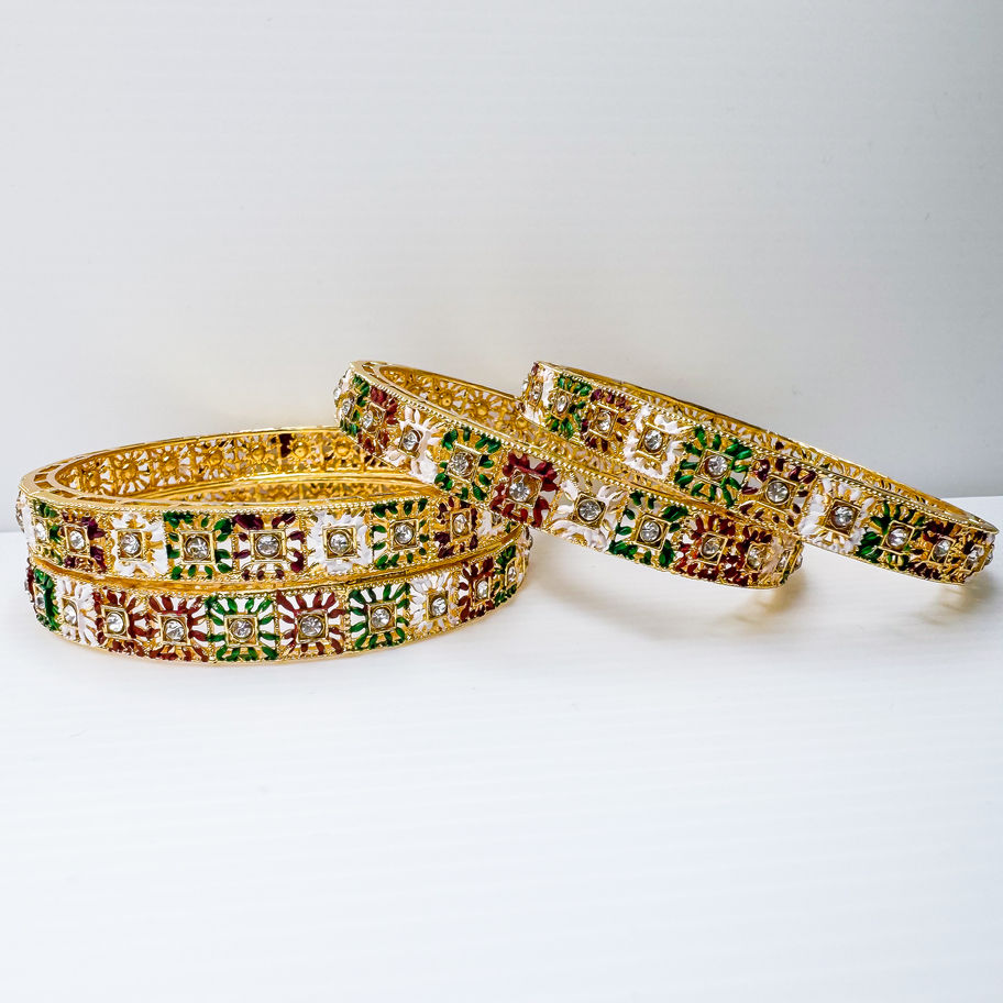 Elevate your traditional look with the *Timeless Grace Gold-Plated Bangle Set*, a true masterpiece of craftsmanship. These exquisitely designed bangles are intricately adorned with vibrant green, red, and white enamel work, bringing together stunning floral and geometric motifs. Each bangle is embellished with sparkling stones, adding a touch of timeless elegance to your collection. Whether you're celebrating a wedding, a festival, or any special occasion, these bangles are the perfect statement piece to complete your ensemble.