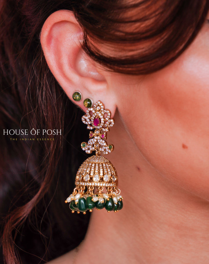 Accent Stones: Kundan stones, pearl beads, green bead dangles