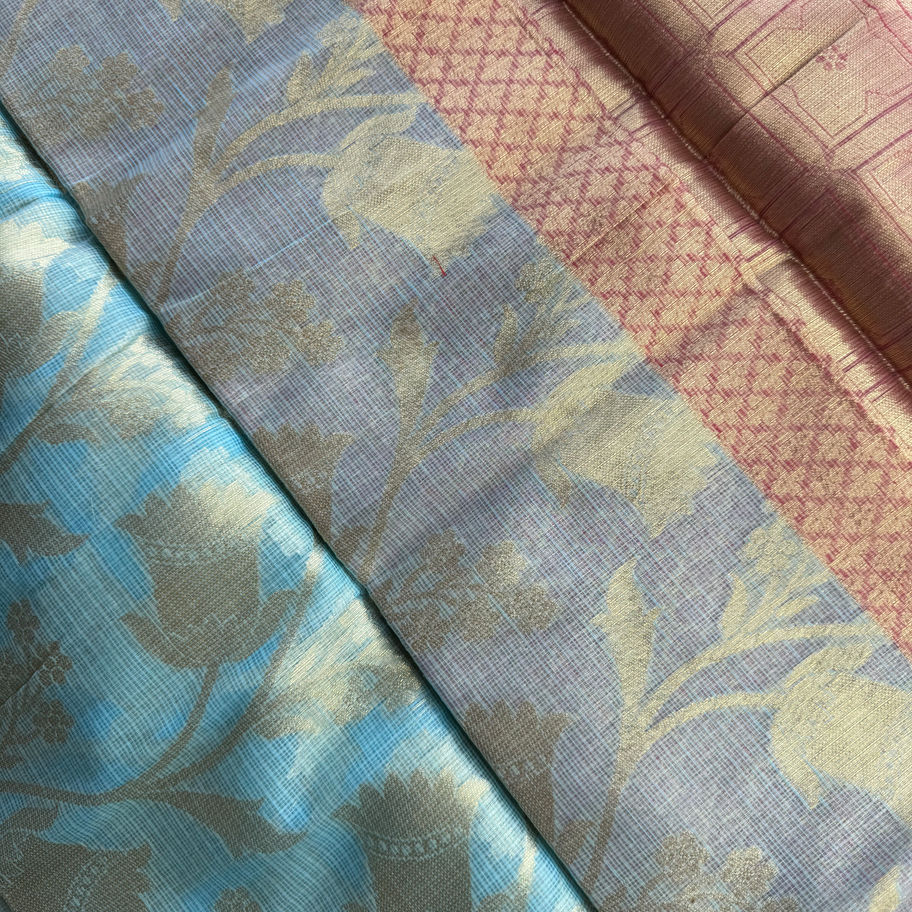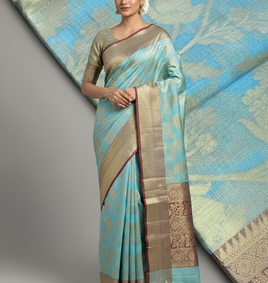 The saree's body features a serene, sky-blue hue, woven with delicate, self-design floral motifs in shimmering gold. This intricate work adds a luxurious texture and a subtle, radiant glow that catches the light beautifully. The fabric, a rich cotton silk, provides the perfect balance of breathability and a graceful, structured drape.