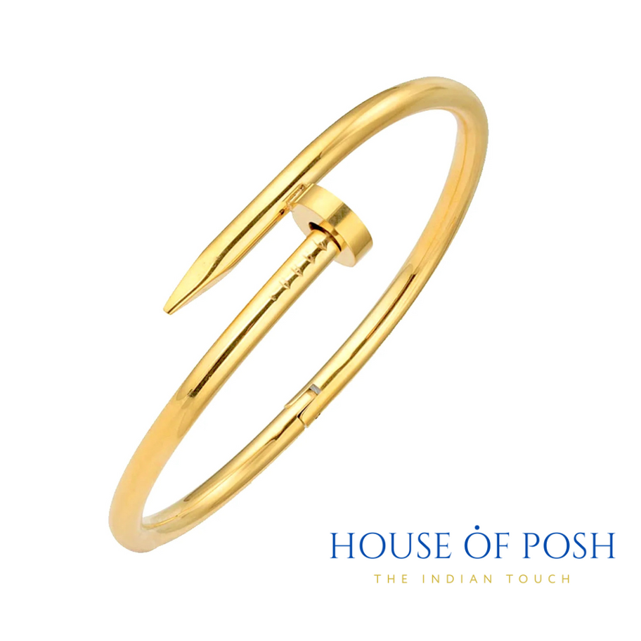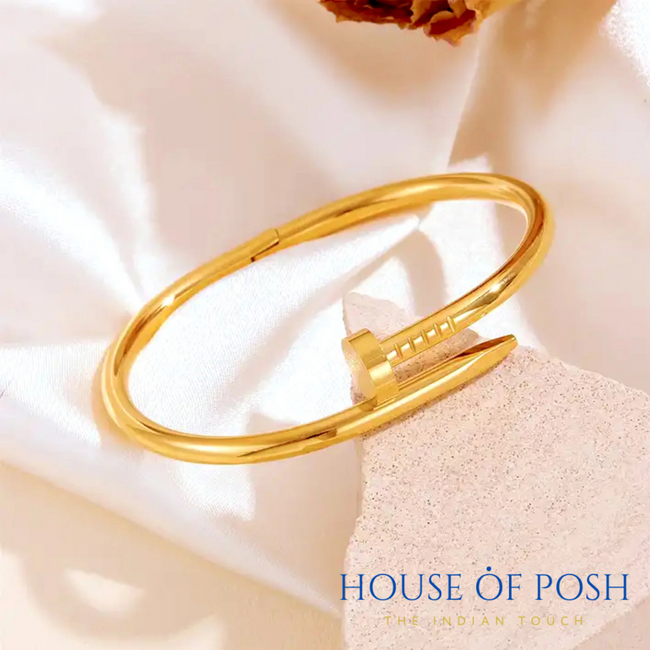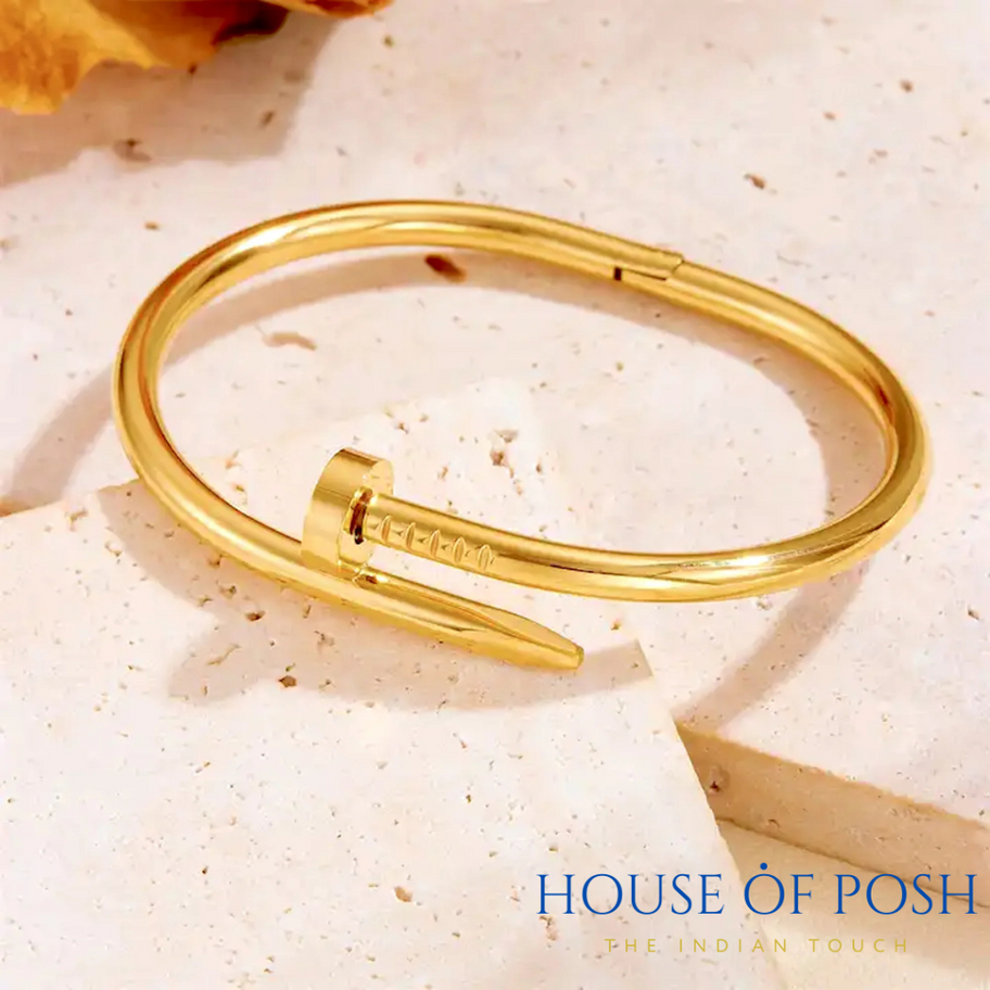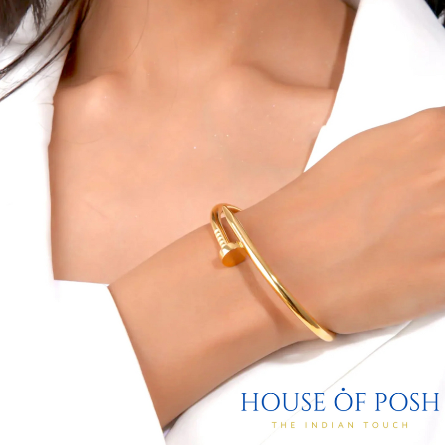 Make a bold statement with the Edgy Elegance Bracelet. This unique piece features a sleek gold-plated band adorned with a striking nail motif, adding a touch of punk rock to your style. The minimalist design is perfect for adding a touch of edge to any outfit. Care Tip: To keep your Edgy Elegance Bracelet shining bright, store it in a cool, dry place away from direct sunlight and moisture.