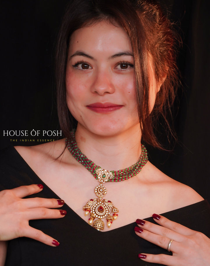 Stone: Green and red beads, kundan stones, pearls, and ruby accents