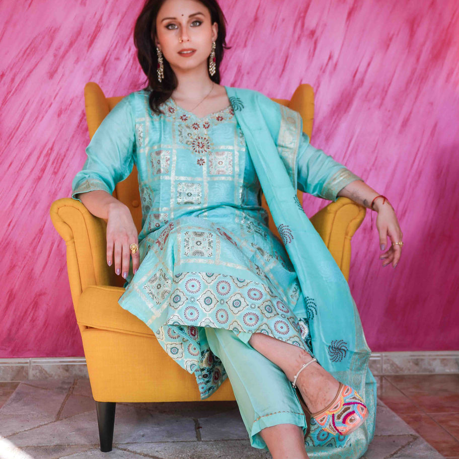 • Dupatta: Coordinated turquoise blue dupatta with matching prints and a lightweight texture