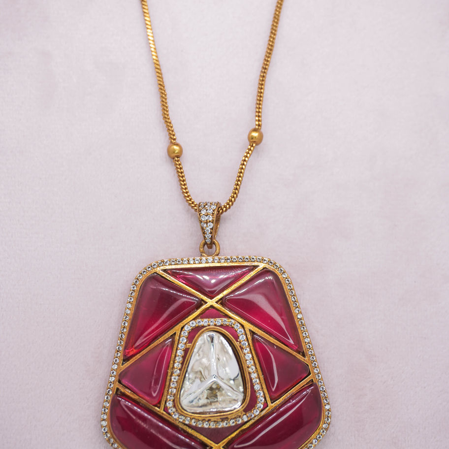 Eye-catching pendant necklace features a large, kite-shaped (or slightly irregular trapezoidal) pendant with a gold-tone setting. The pendant's surface is divided into geometric segments by gold-tone lines, filled with a rich, glossy burgundy (or deep red) enamel. A large, clear, triangular-shaped crystal, possibly quartz or glass, is centrally placed within the enamel sections. This crystal is also outlined in gold-tone metal and surrounded by a border of small, sparkling crystals or rhinestones. The pendant hangs from a delicate gold-tone chain with small bead accents.