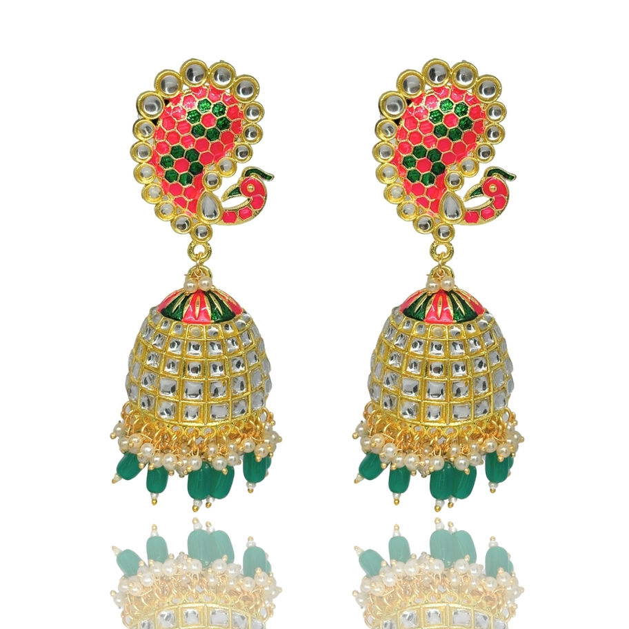 Step into a world of enchantment with these exquisite Indian Jhumka earrings, where vibrant hues meet intricate design. Inspired by the majestic peacock, these earrings are a celebration of rich cultural heritage and unparalleled artistry. The delicate jhumka design, adorned with a captivating blend of emerald, ruby, and white stones, adds a touch of ethereal elegance. Whether you're dressing up for a special occasion or adding a touch of bohemian flair to your everyday look, these earrings are sure to make a statement.