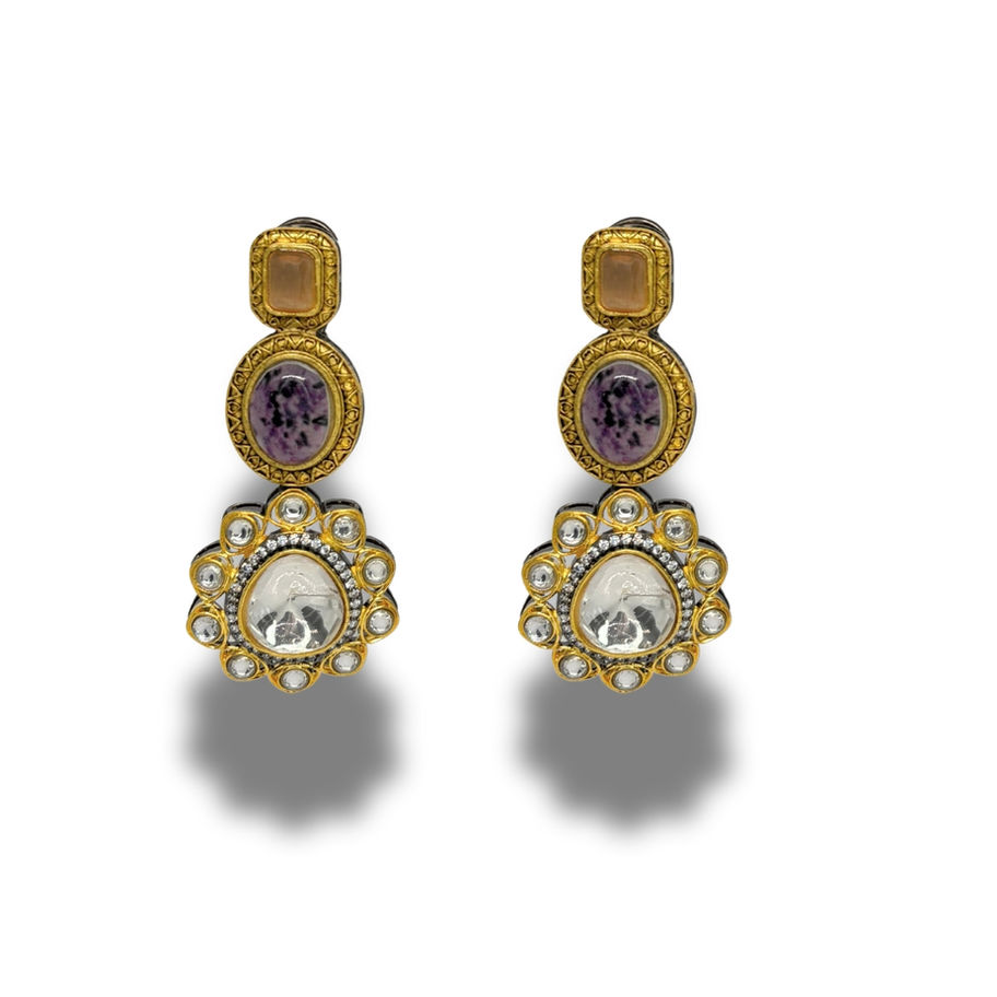Step into a world of enchantment with these exquisite Indian earrings, a symphony of color and design. Adorned with a mesmerizing amethyst stone and shimmering crystals, these earrings are a celebration of rich cultural heritage and unparalleled artistry. The intricate design adds a touch of ethereal elegance. Whether you're dressing up for a special occasion or adding a touch of bohemian flair to your everyday look, these earrings are sure to make a statement.