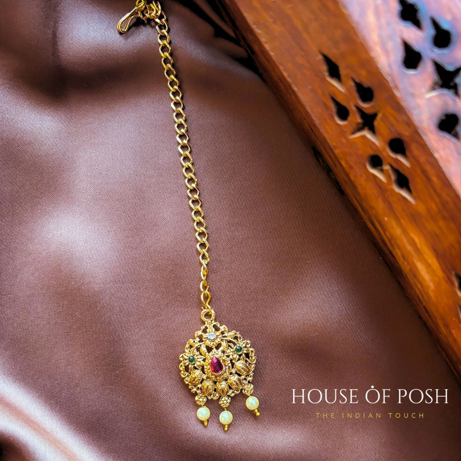 This gold-toned maang tikka showcases a captivating floral design with a ruby center and emerald accents. It's perfect for adding a touch of elegance and enchantment to your traditional attire.