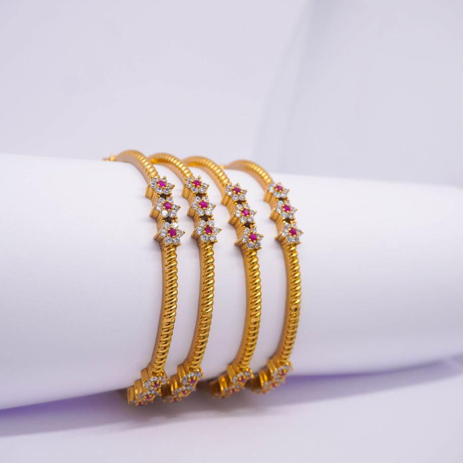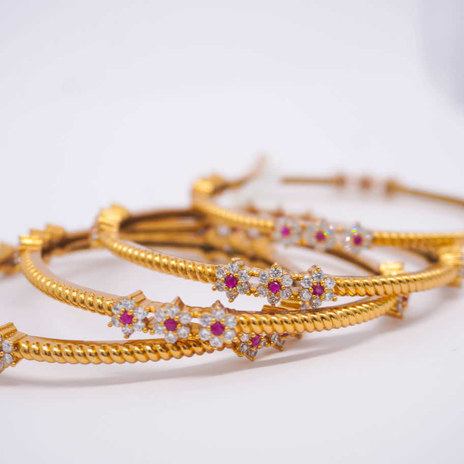 Indulge in the epitome of grace and glamour with this stunning bangle set. Each bangle is a masterpiece, adorned with sparkling stones that catch the light and create a mesmerizing effect. This set is the perfect accessory to elevate any outfit, from casual to formal.