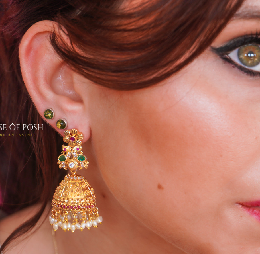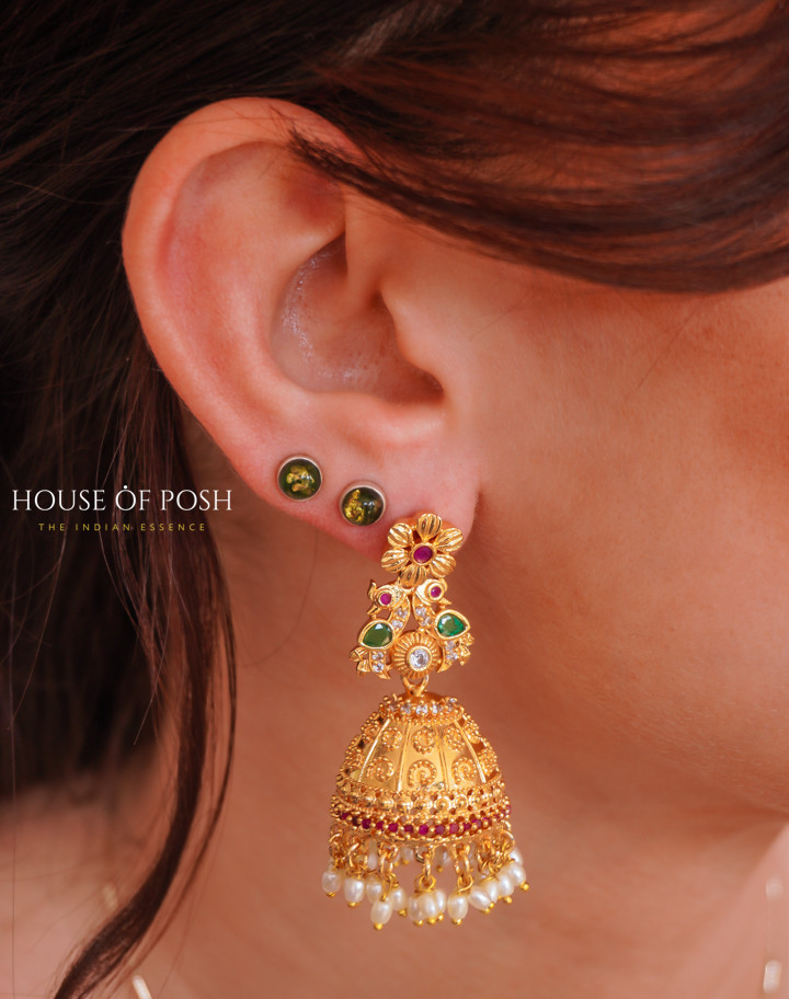 Gold-Plated Jhumka Earrings with Green & Ruby Accents