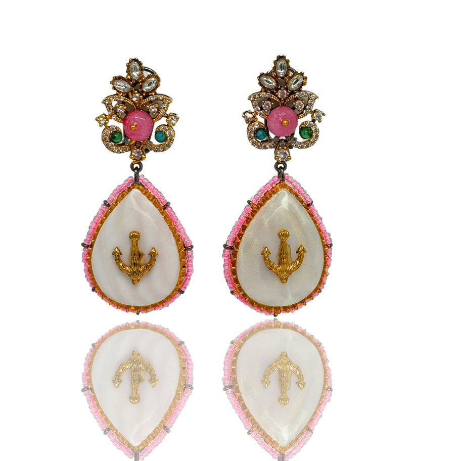 Set sail for style with these exquisite Indian earrings, a fusion of nautical charm and elegant design. Featuring a delicate shell-shaped pendant adorned with an anchor charm and framed by shimmering beads, these earrings are a celebration of rich cultural heritage and unparalleled artistry. Whether you're dressing up for a special occasion or adding a touch of bohemian flair to your everyday look, these earrings are sure to make a statement.