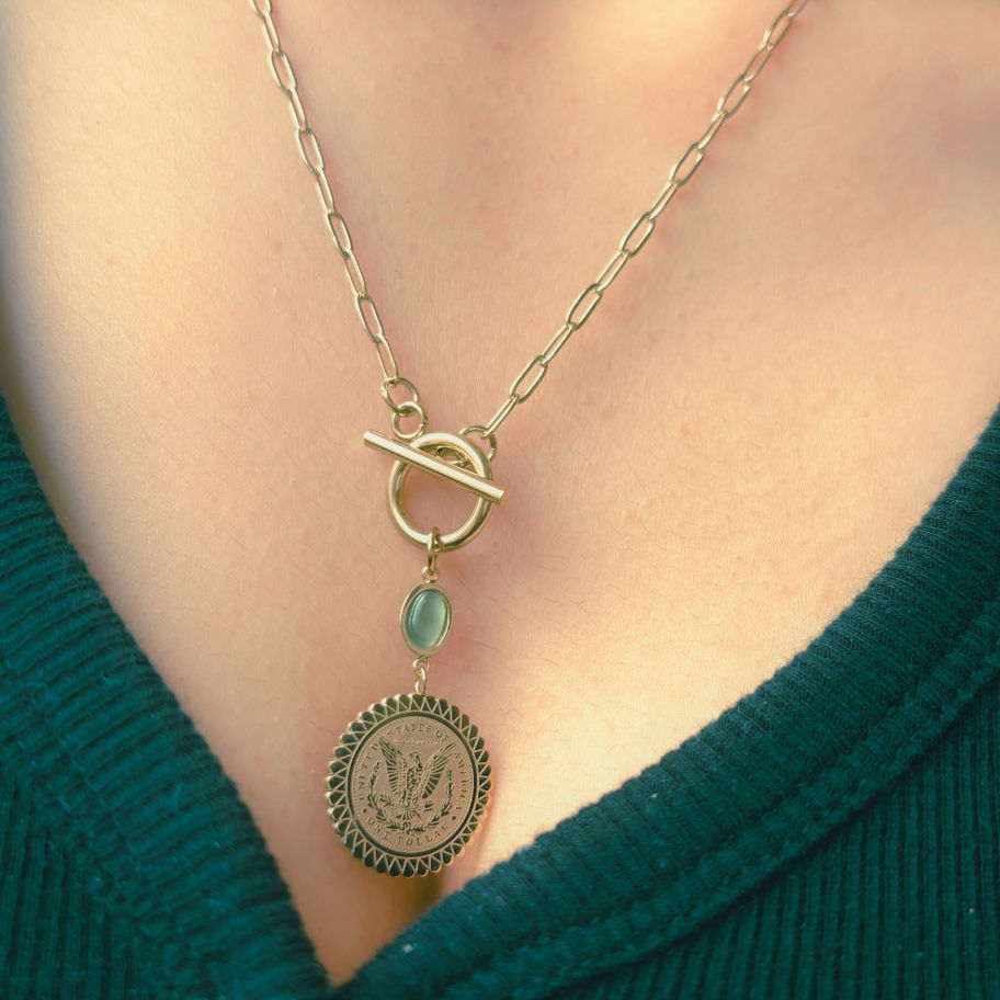 Elevate your style with this celestial-inspired disc necklace. Featuring a delicate gold-tone chain and a circular pendant adorned with intricate details and a sparkling green stone, this necklace adds a touch of ethereal beauty to any outfit.
