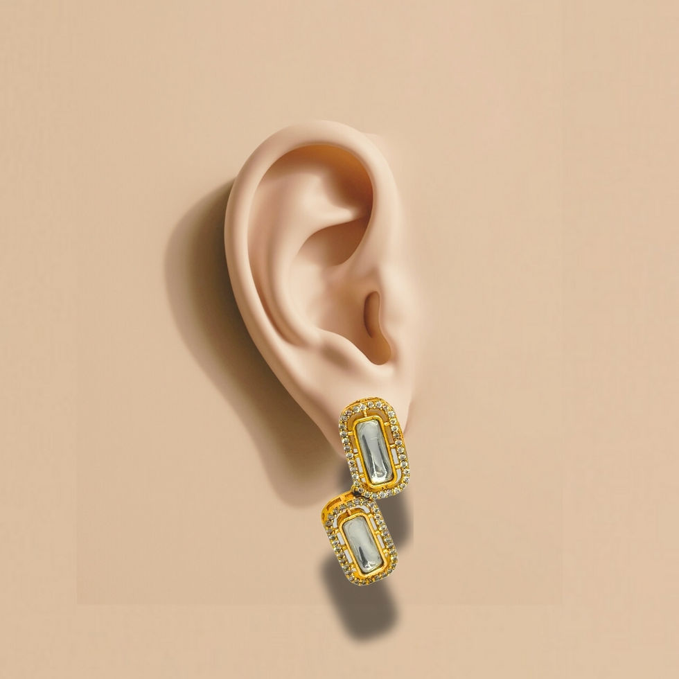 Experience the allure of these exquisite Indian earrings, where minimalist design meets sparkling elegance. Featuring a geometric rectangular shape adorned with shimmering crystals, these earrings are a celebration of rich cultural heritage and unparalleled craftsmanship. The clean lines and elegant design make them a versatile accessory that can be dressed up or down with ease.