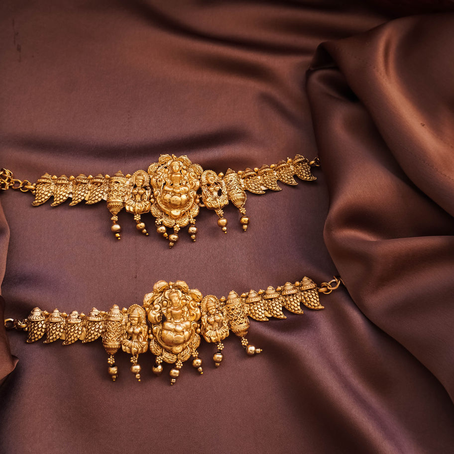 Exquisite gold-toned armbands showcasing intricate traditional Indian craftsmanship. Featuring a regal deity motif at the center, adorned with delicate filigree and elegant detailing for a touch of cultural opulence. Perfect for making a bold statement at special occasions