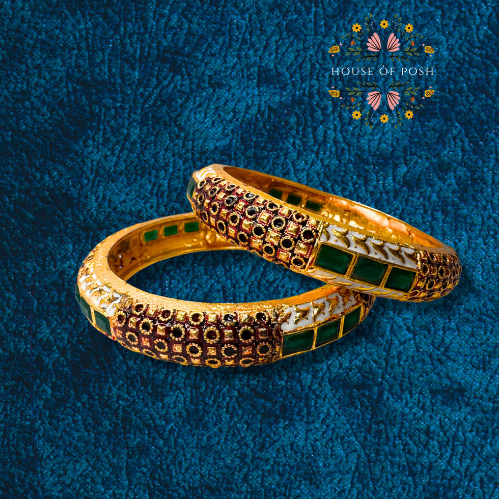 These exquisite *Eternal Elegance Enamel Bangles* are a stunning blend of tradition and elegance. Crafted in a luxurious gold tone, they are intricately adorned with vibrant black and red enamel details, radiating timeless charm. The perfect accessory to enhance any outfit, these bangles offer a beautiful fusion of classic artistry and contemporary style.