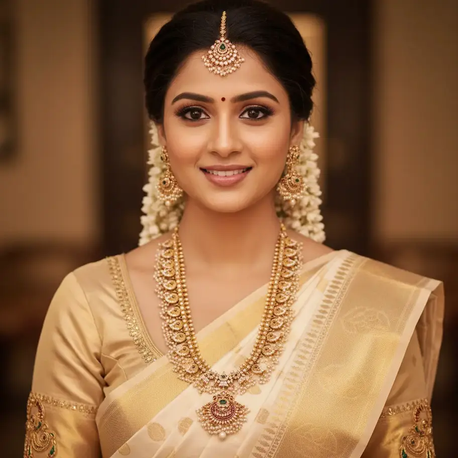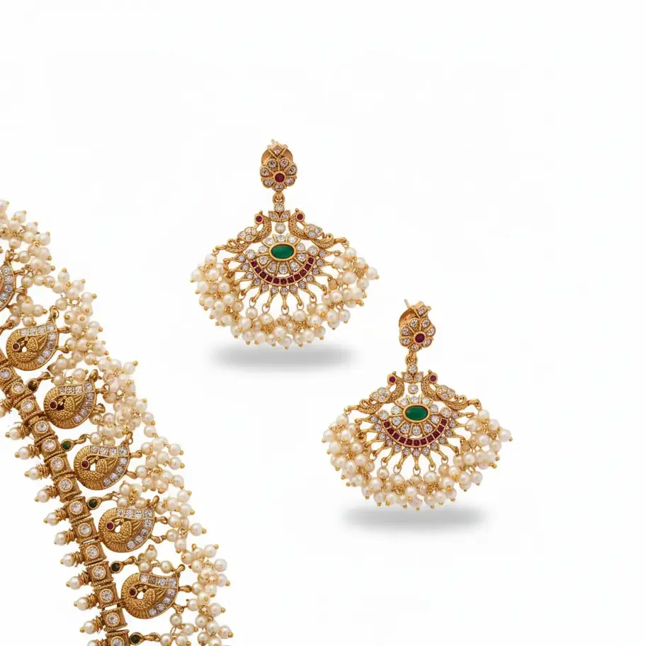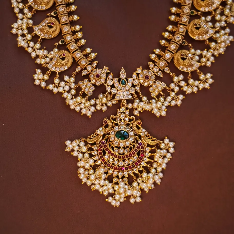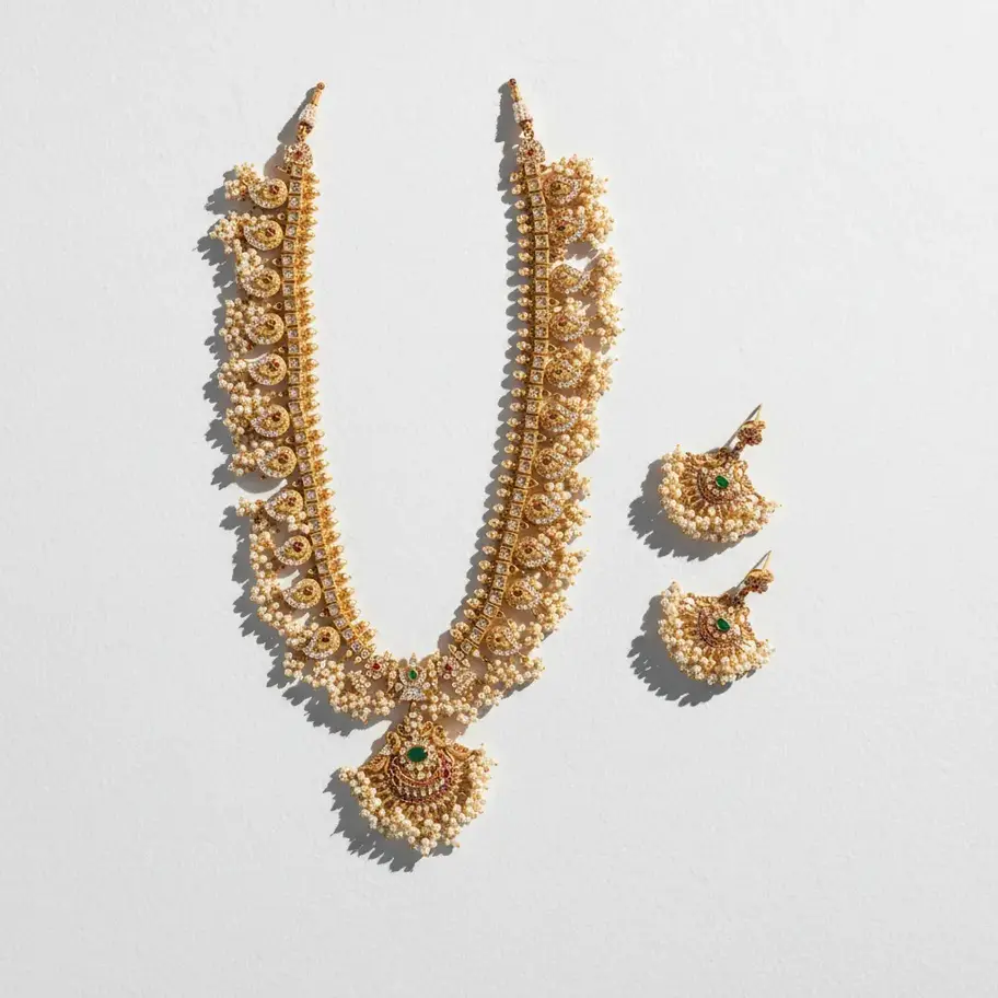 This ornate necklace and earring set showcases intricate gold work, likely gold-plated or gold-tone, featuring delicate pearl or bead accents. The design incorporates traditional Indian motifs, possibly including peacocks or floral patterns, with colorful gemstone accents adding vibrancy. The overall effect is a rich and luxurious piece, perfect for special occasions