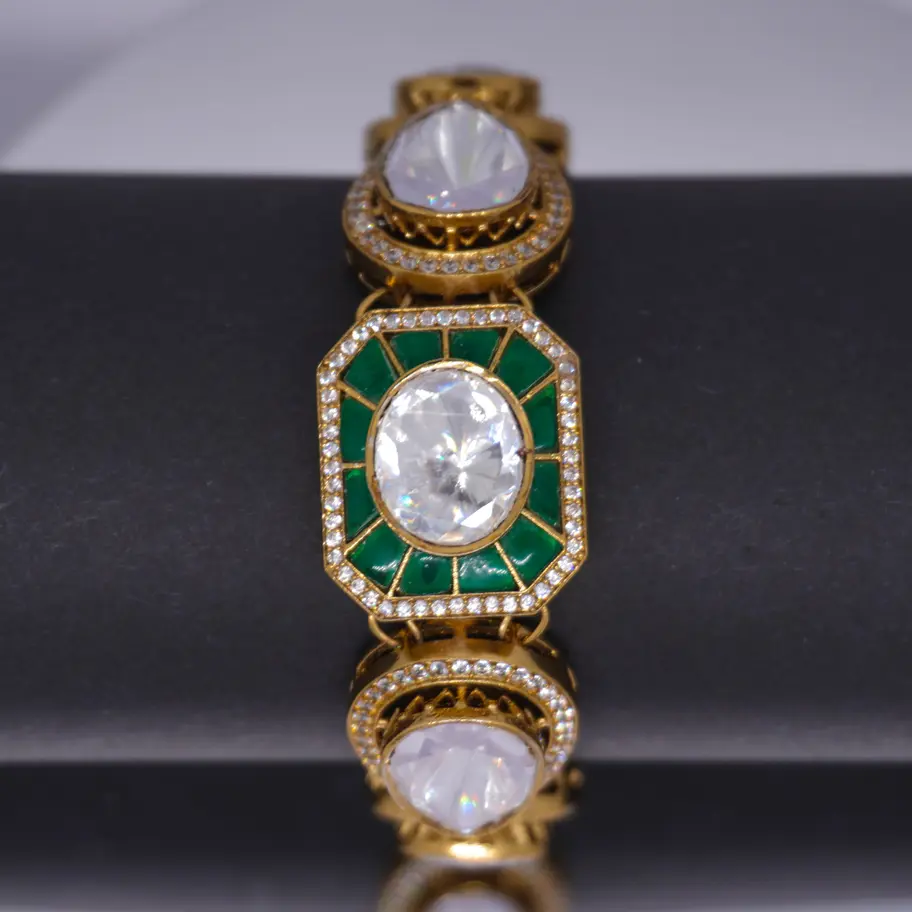 This elegant bracelet showcases a stunning array of white and green gemstones set in a gold-tone frame, creating a sophisticated and eye-catching look.