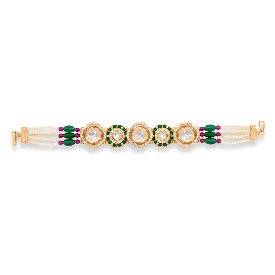 A stunning bracelet featuring luminous Kundan stones set in gold-tone frames with green enamel detailing. Enhanced with delicate pearl strands and accented with green and ruby beads.
