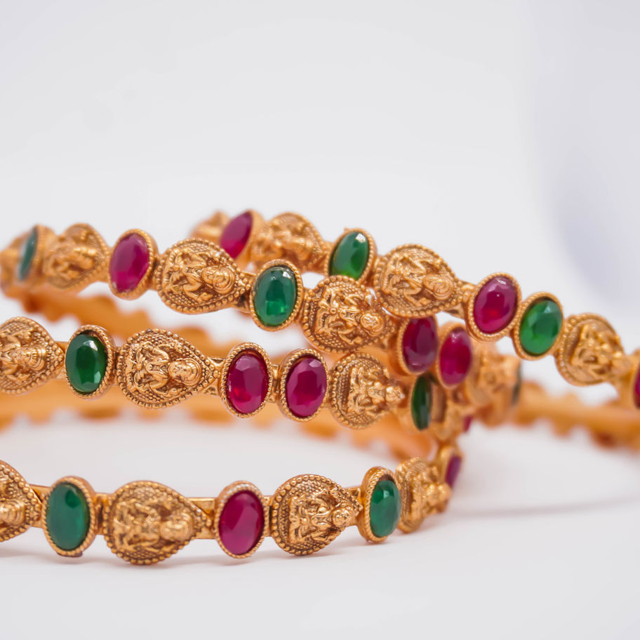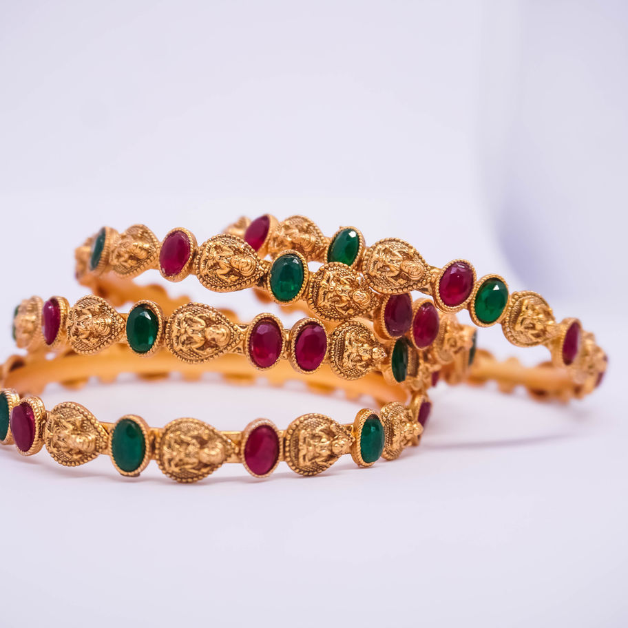 This exquisite gold bangles is a stunning fusion of tradition and elegance, featuring vibrant red and green gemstones set in intricate gold craftsmanship. Each gemstone is complemented by finely detailed deity-inspired motifs, embodying the essence of sacred artistry. Perfect for festive occasions, weddings, or as a statement accessory, these bangles reflects the timeless beauty of heritage jewelry.