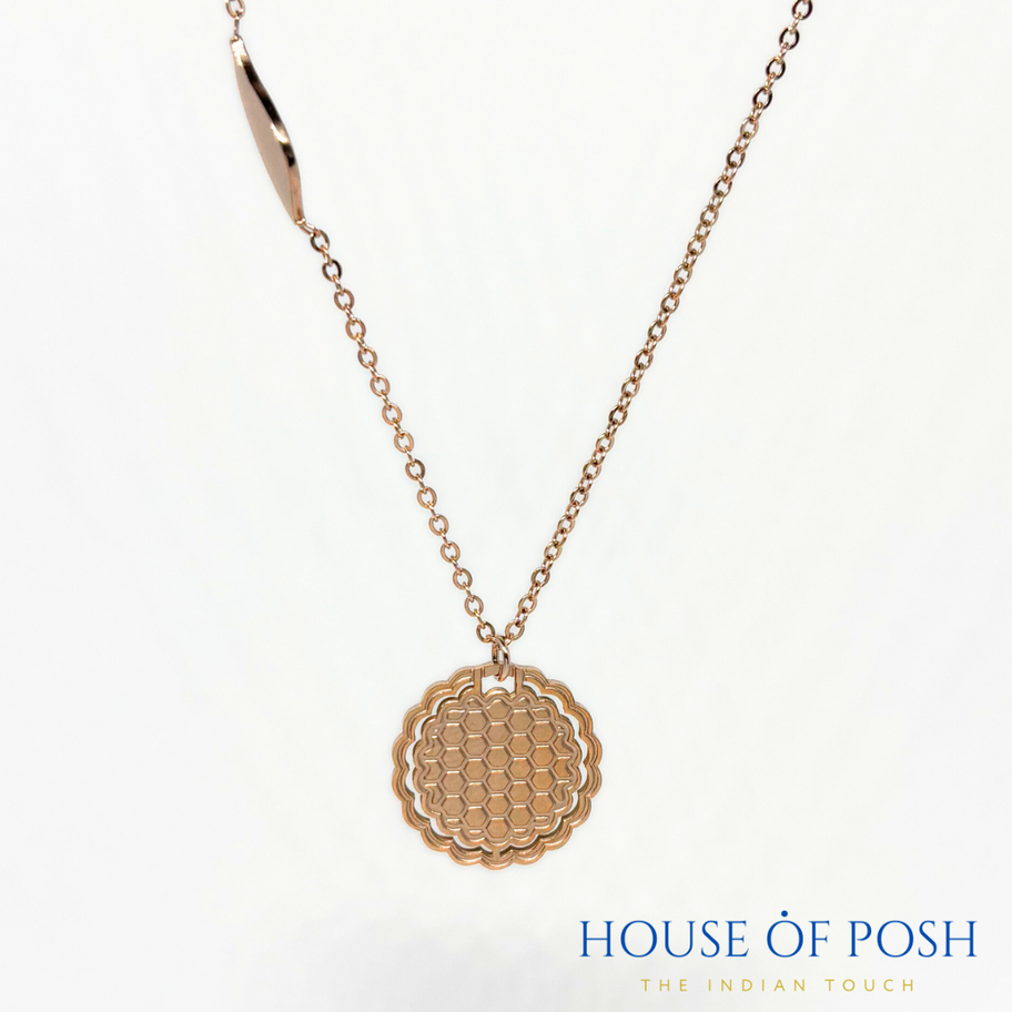 Embrace the allure of this exquisite Indian necklace, where geometric design meets minimalist elegance. Featuring a captivating hexagon pendant with a honeycomb pattern, this necklace is a celebration of rich cultural heritage and unparalleled craftsmanship. The delicate chain and intricate design add a touch of sophistication, making it a versatile accessory that can be dressed up or down with ease.