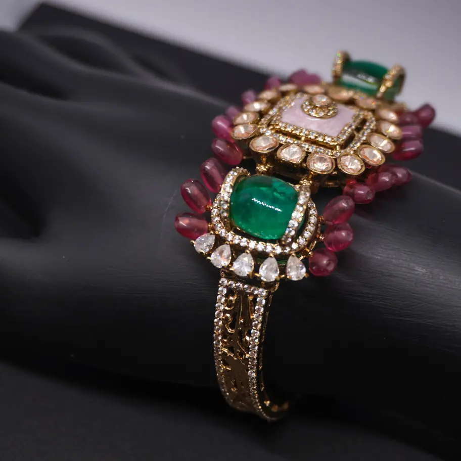 The central motif features a stunning arrangement of vibrant gemstones, including emerald and ruby, set in a gold-toned frame. A cluster of sparkling cubic zirconia stones, creating a truly dazzling piece.