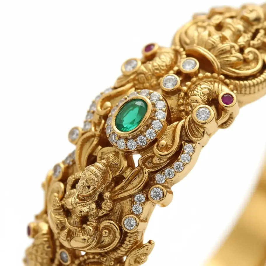 A single, heavy Temple Kada is the ultimate high-fashion choice for modern ethnic styling. It allows the intricate deity motifs to be the undisputed star of your outfit.