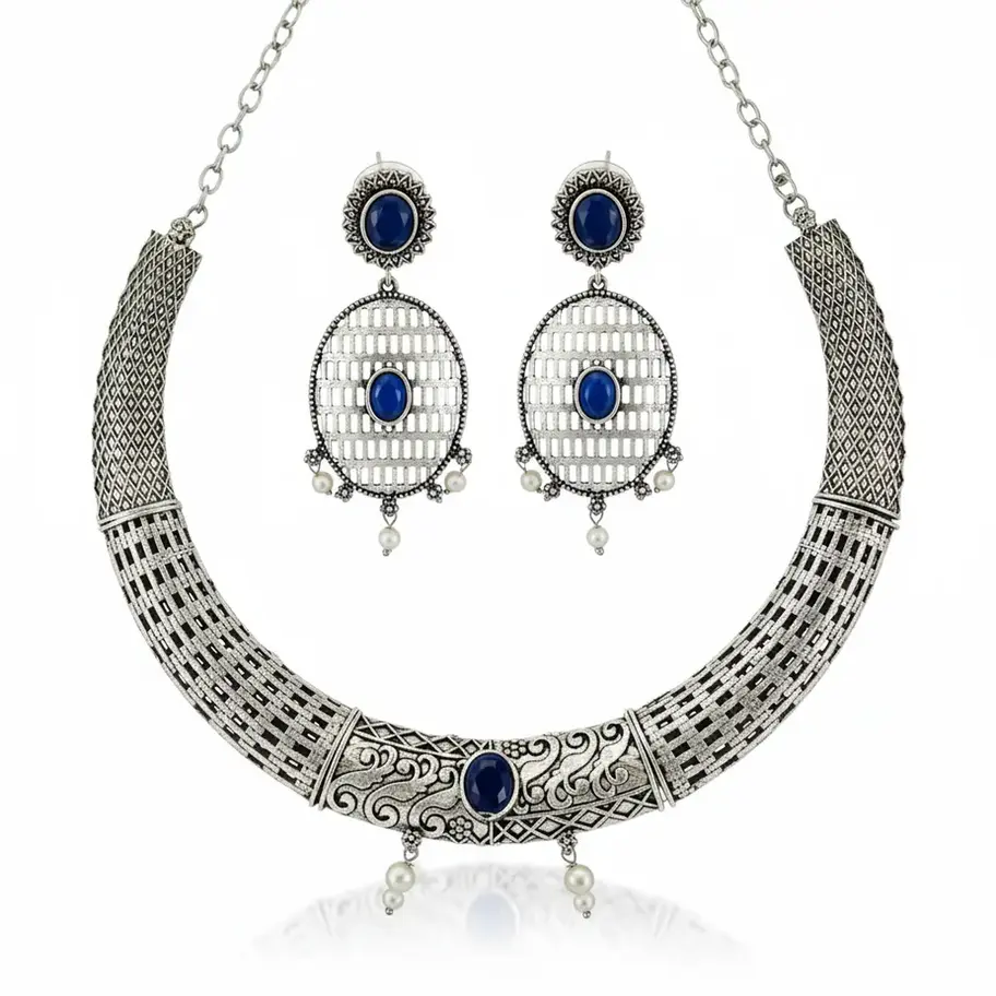 Make a grand entrance with our Sapphire Heritage Choker Set. This masterfully crafted piece blends the mystery of oxidized silver with the regal brilliance of sapphire-blue cabochons.