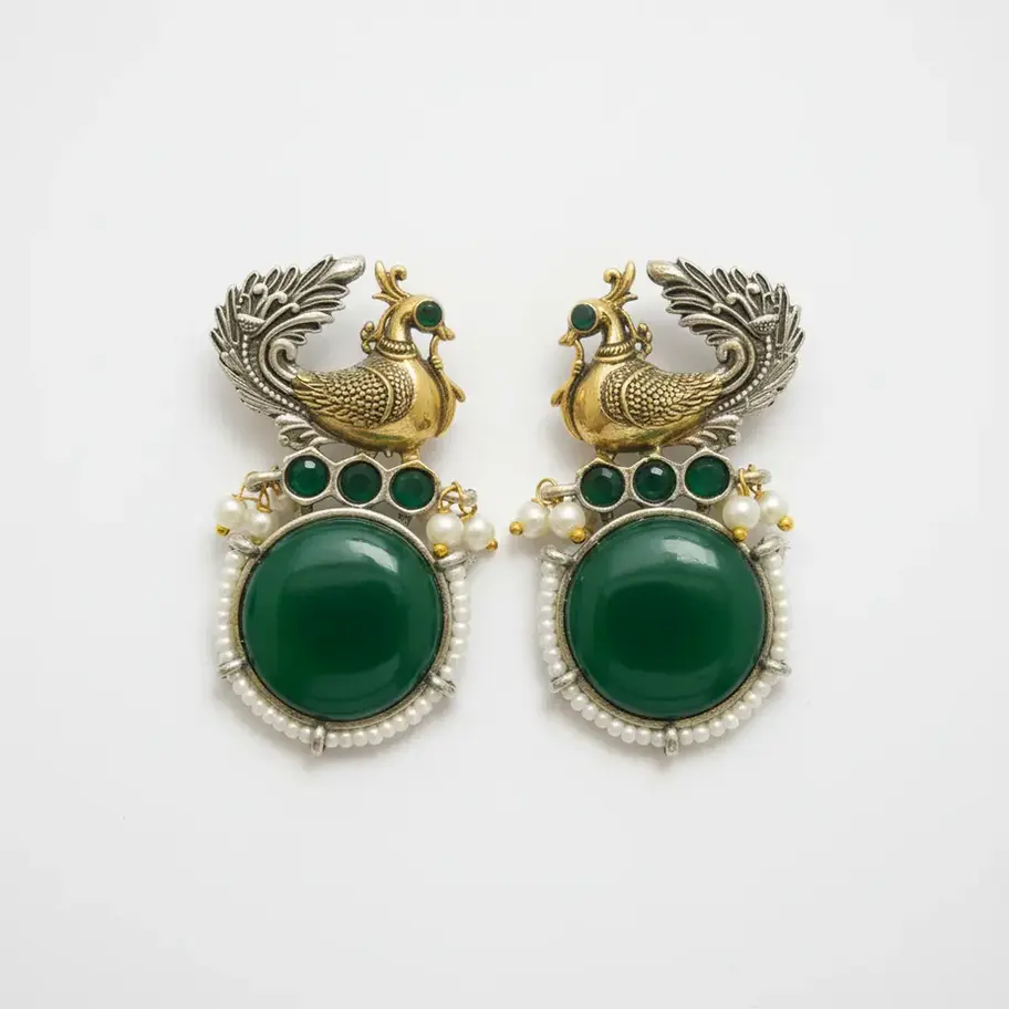 Prompt: "Professional high-end luxury e-commerce photography. A pair of dual-toned oxidized earrings, exactly 4cm in length. The top features a highly detailed 18k gold-plated peacock. The bottom features a deep emerald-green cabochon surrounded by a border of tiny white seed pearls. Isolated on a solid, clean neutral white background (Hex #FBFBFB). Symmetrical arrangement. LIGHTING: Intense studio lighting. SHADOW: Strictly NO blurry clouds. Only a razor-thin, dark 'contact crease'. 8k resolution, clinical luxury brand aesthetic."