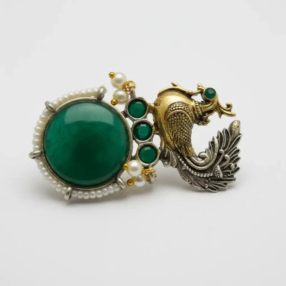 Stones: Deep Emerald-Green Cabochon (faceted) and Micro White Seed Pearls.