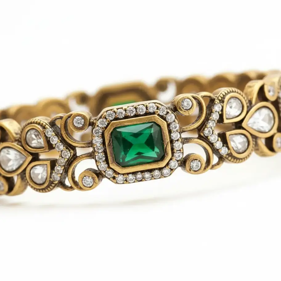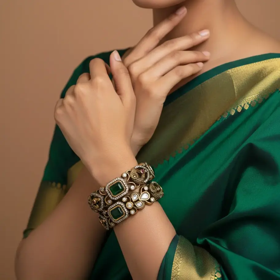 Elevate your jewelry collection with our "Mayura Heritage" Kada Set. Hand-finished in a sophisticated 18k gold plating, these bangles offer a rich, antique glow that perfectly mimics high-jewelry heirlooms. Each piece features a repeating deep-relief peacock motif, accented with brilliant ruby-red eyes and majestic rectangular emerald-green stones.