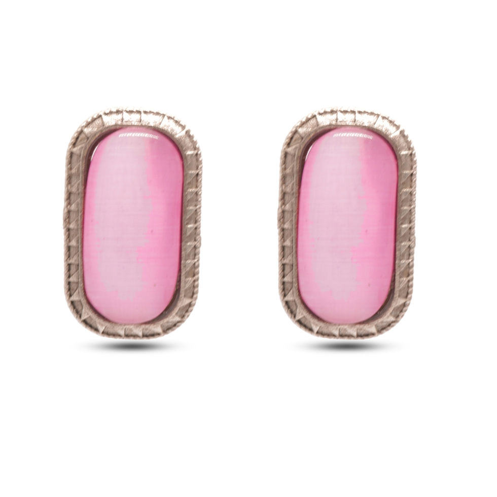 These eye-catching earrings showcase smooth, cabochon-cut pink cat's eye stones, each framed by a detailed textured silver setting. The elongated shape and unique optical effect of the stones make them a truly distinctive accessory.