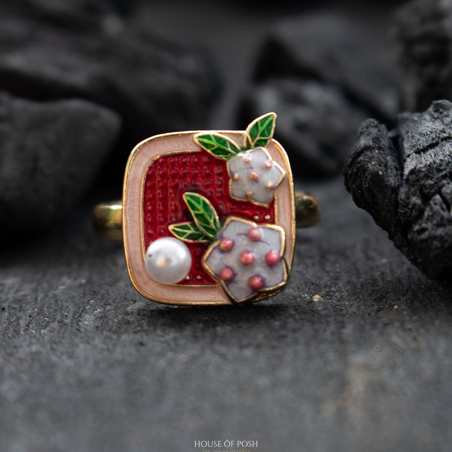 The ring is crafted from brass with a rich gold polish. It features a contemporary square enamel face with a vibrant, deep red (or ruby) textured background. Against this dramatic backdrop, two delicate white/pale pink flowers are rendered, accented by bright green leaves and a lustrous faux pearl. The decorative soft pink border frames the artwork, giving the piece a sophisticated, artistic quality while remaining lightweight for comfortable wear.