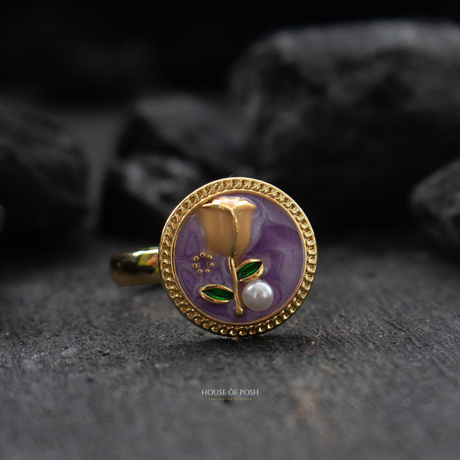 Crafted from brass with a rich gold polish, the ring features a perfectly round enamel face. The background is a mesmerizing deep lavender/purple marbled enamel that sets a luxurious tone. Against this unique backdrop, a delicate rose (or tulip) bloom is rendered in soft tan, accented by a bright green leaf and a lustrous faux pearl. The decorative gold rope border frames the scene, highlighting its vintage appeal while the lightweight design ensures all-day comfort.